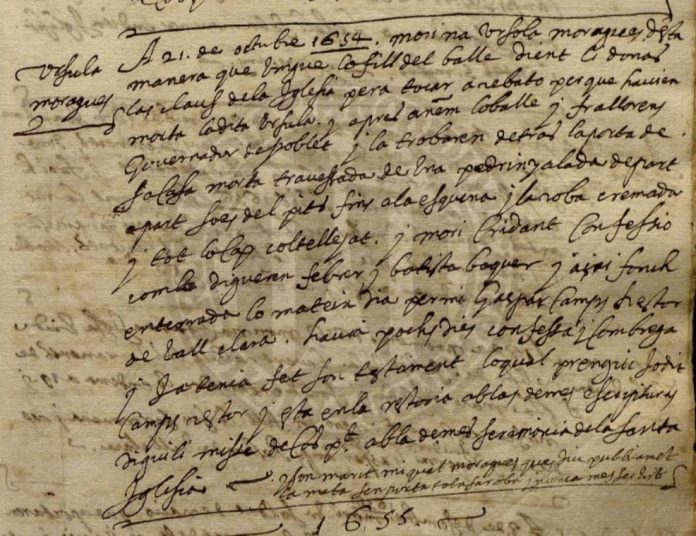“A 21 de octubre de 1654, morí na Ursula Moragues desta manera que vingue lo fill del balle dient li donas las claus de la Iglesia pera tocar arebato perque havien mort ladita Ursula y apres anaren lo balle y fra Llorenç Governador de Poblet y la trobaren detras de la porta de la casa morta travesada de una padrinyalada de part a part so es del pit fins l’esquena i la roba cremada y tot lo cos coltellejat, y mori cridant confesio com lo digeren Febrer i Batista Boquer y aixi fonch enterrada lo mateix dia per mi Gaspar Camps Rector de Vallclara , haura pocs dies confessa y combrega y ja fet son testament lo qual prengui lo dit Camps Rector y esta en la rectoria ab las demes escriptures diguili missa de cos present  abla demes seremonia de la Santa Iglesia. Son marit Miqel Moragues ques diu publicament la mata sen porta tota la roba y nunca mes ses vist.”